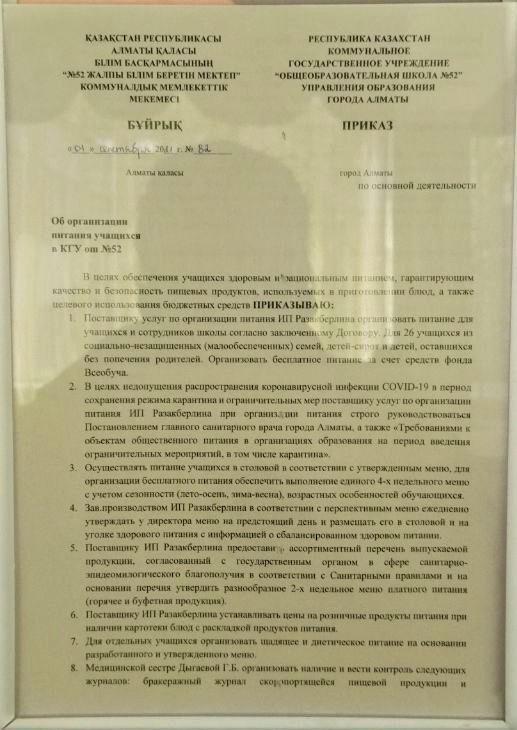 Приказ об организации питания учащихся в КГУ ОШ№52