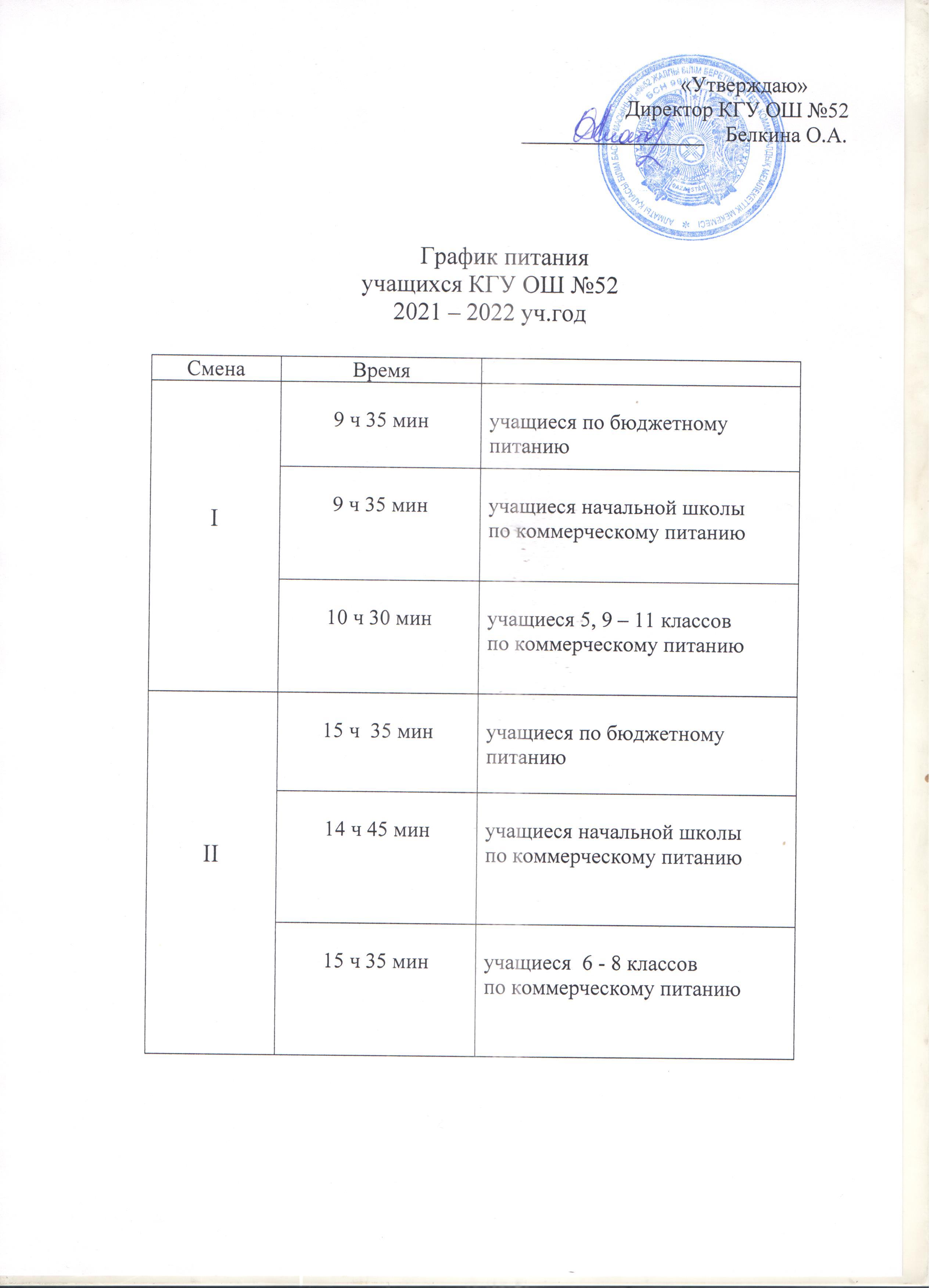 Приказ об организации питания учащихся в КГУ ОШ№52