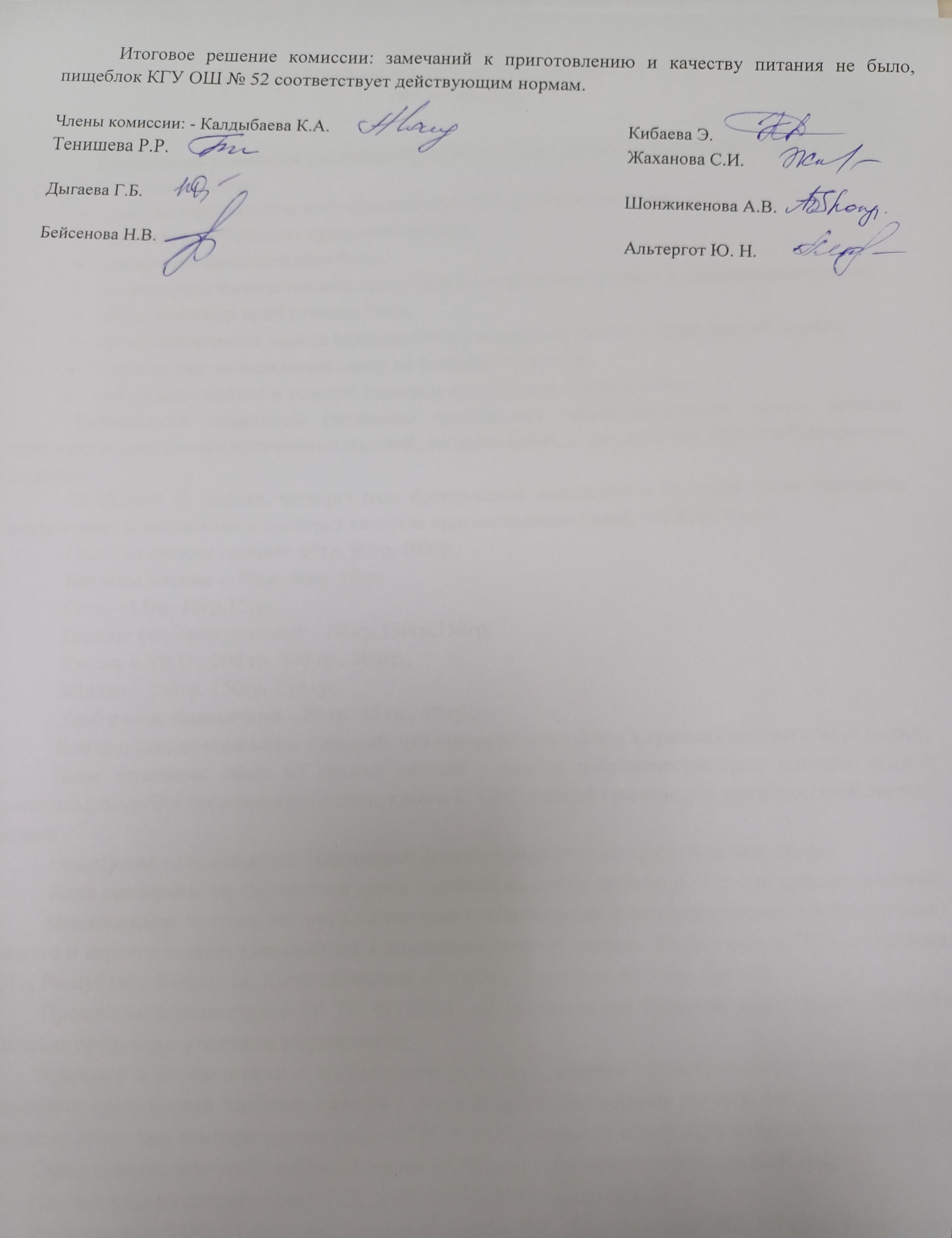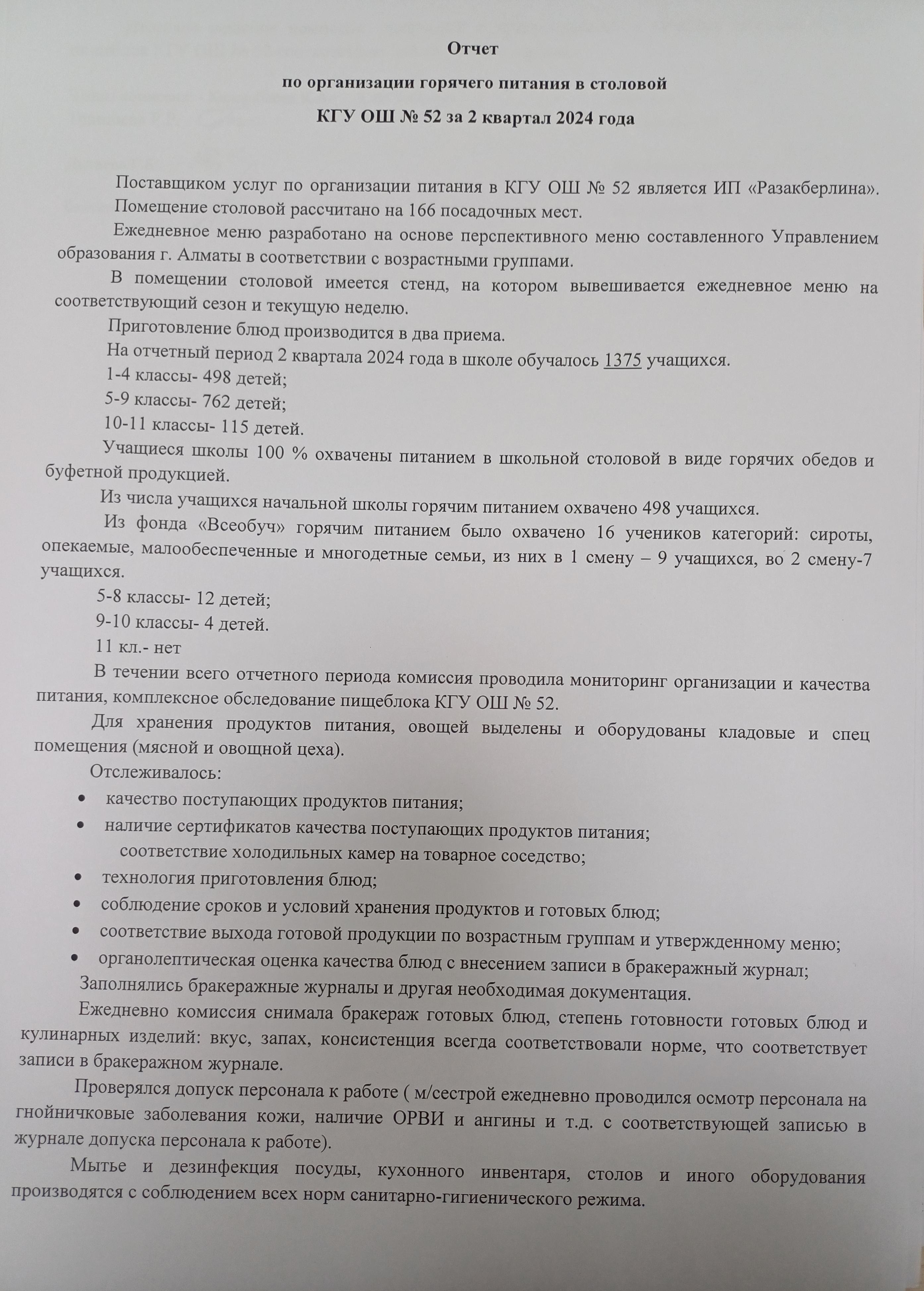 » Отчёт по организации горячего питания в столовой КГУ ОШ 52 за 2 квартал 2024