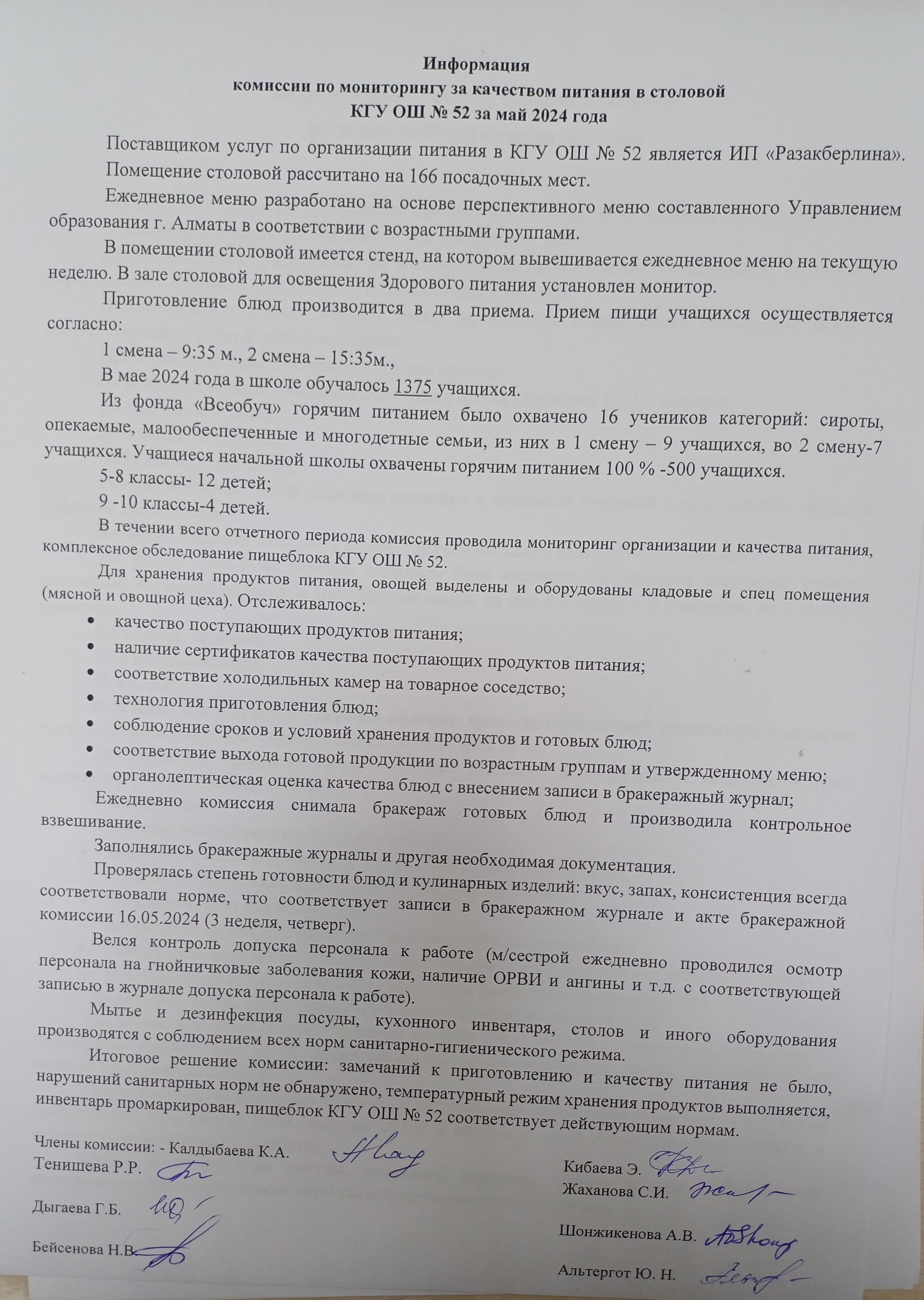 24 май 2024 0 1 2 3 4 5 Информация комиссии по мониторингу за качеством питания в столовой КГУ ОШ 52 за май 2024