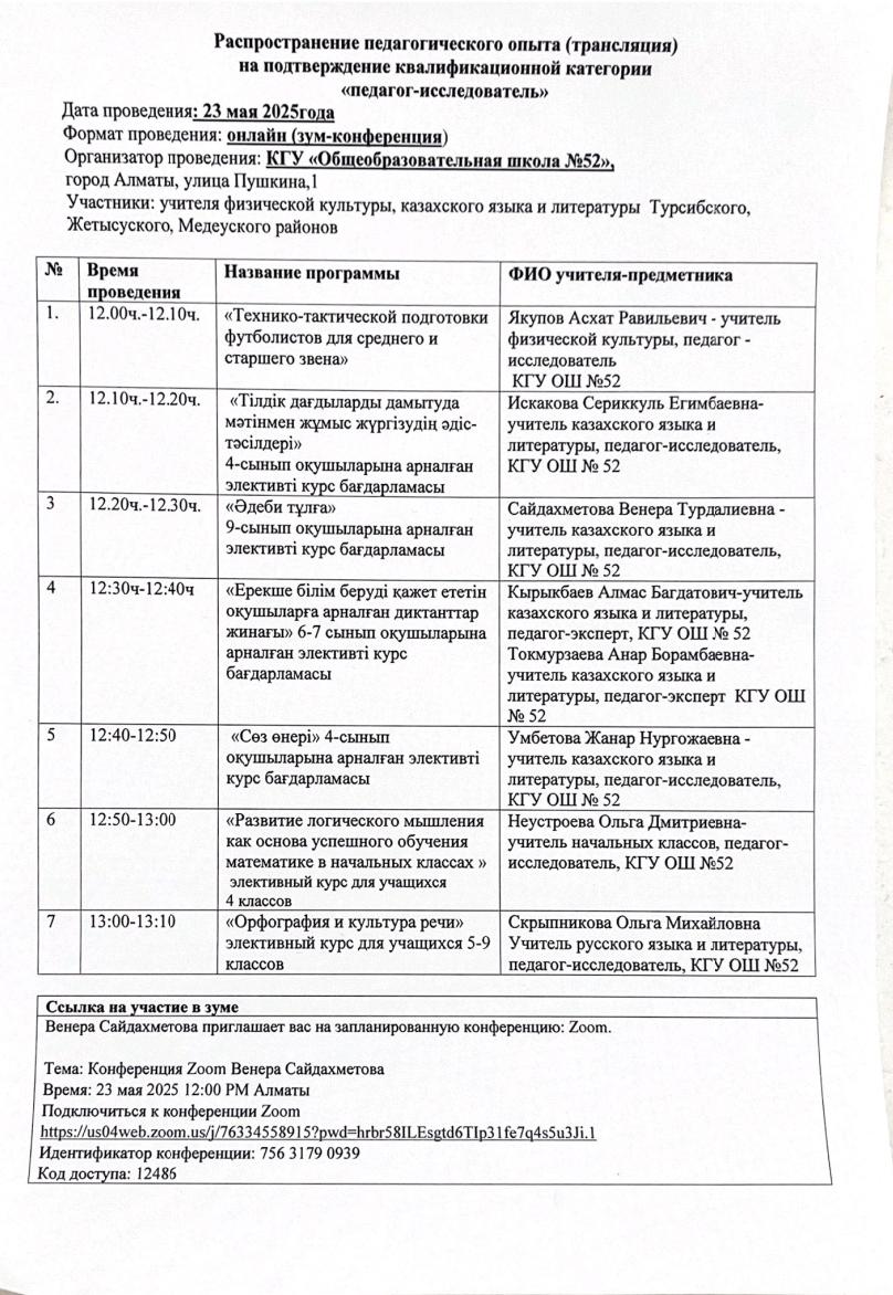 23 май 2025 0 1 2 3 4 5 “Педагог-зерттеуші” біліктілік санатын қорғайтын мұғалімдердің авторлық бағдарламалары бойынша іс-тәжірибесін таратуы/Распространение опыта по авторским программам учителей, подтверждающих квалификационную категорию "педагог-исследователь".