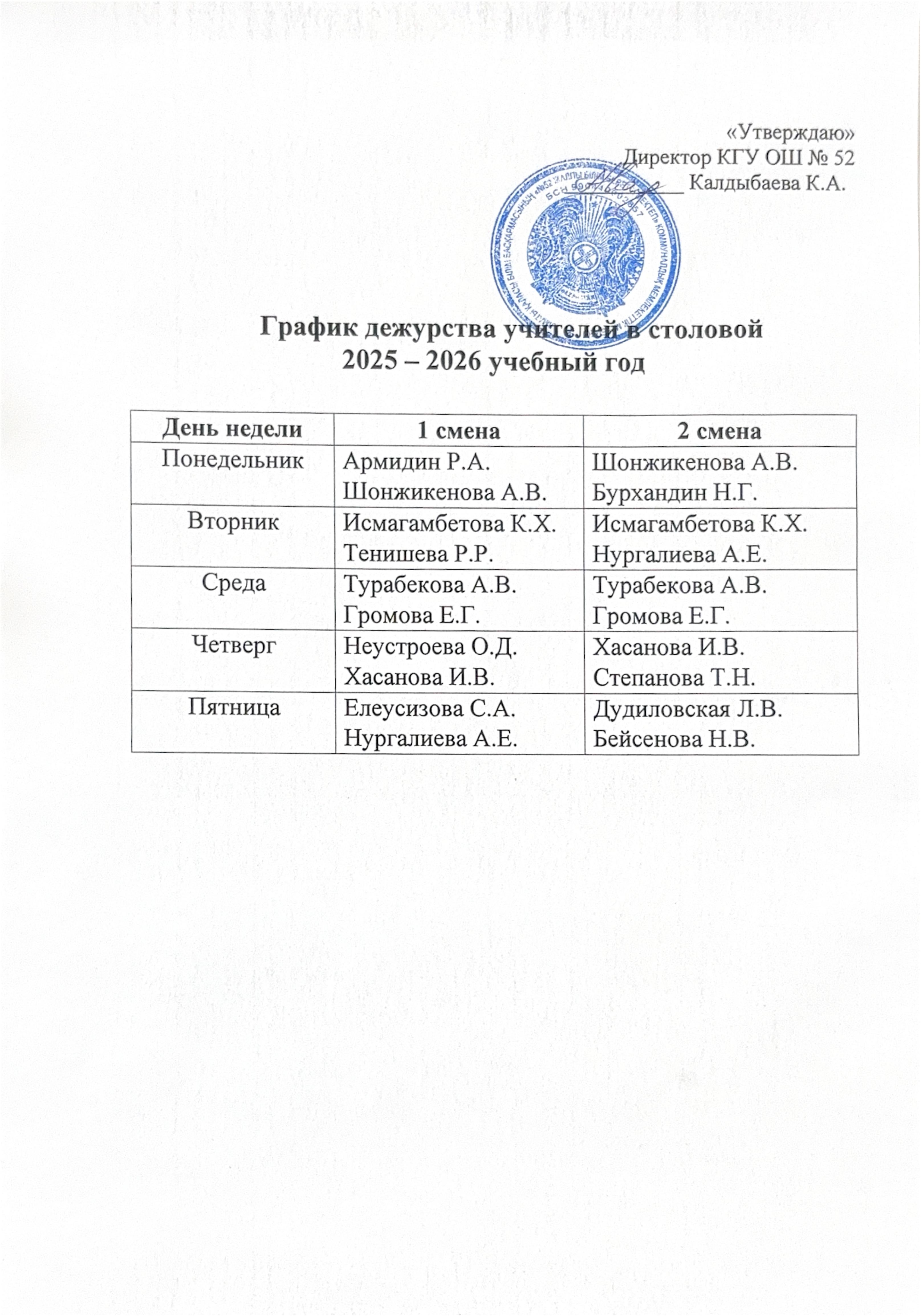 Асханадағы мұғалімдердің кезекшілік кестесі 2021 - 2022 оқу жылы