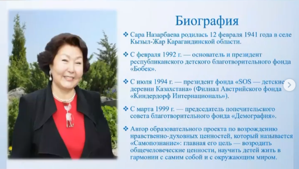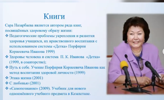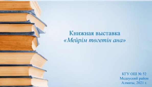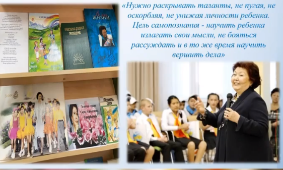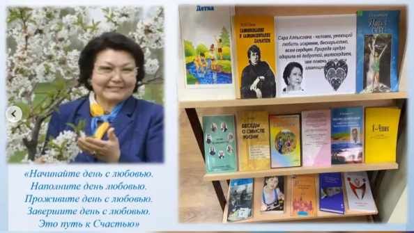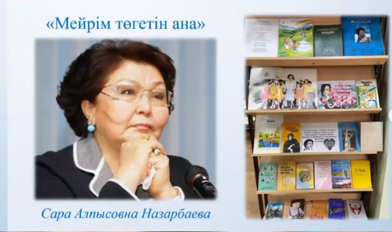Согласно плану мероприятий, 1 февраля 2021 года в библиотеке школы была организована книжная выставка «Мейірім төгетін ана» о деятельности автора программы и проекта нравственно-духовного образования «Самопознание» - Сары Алпысовны Назарбаевой.