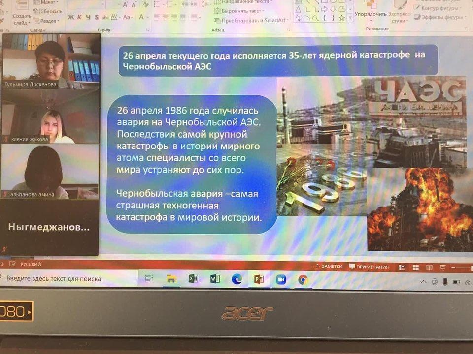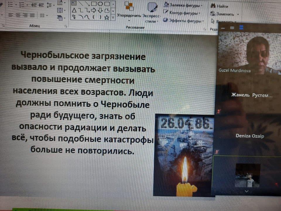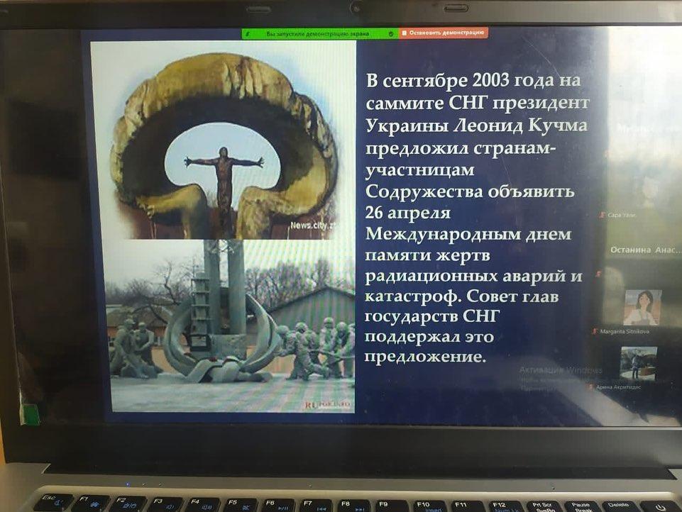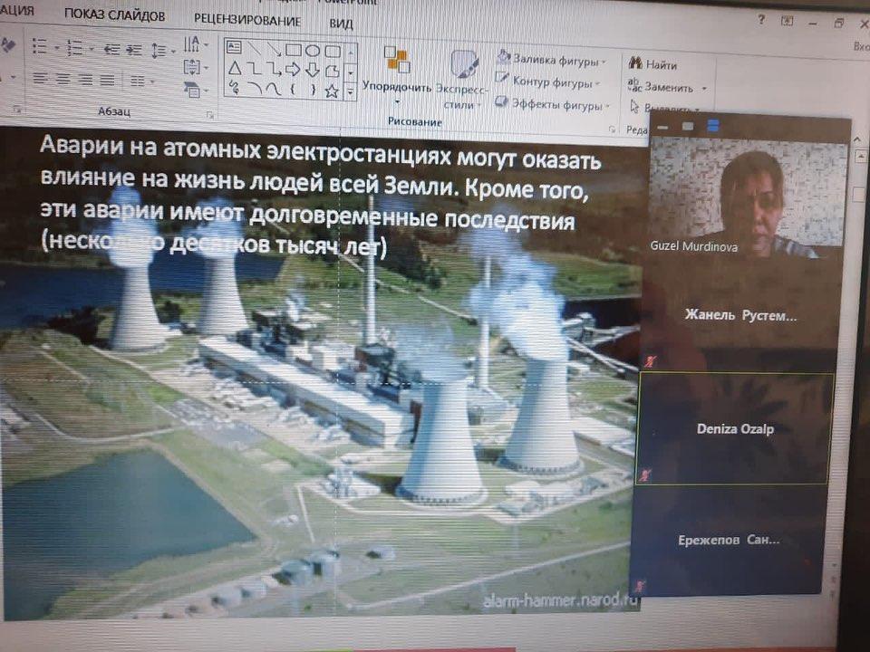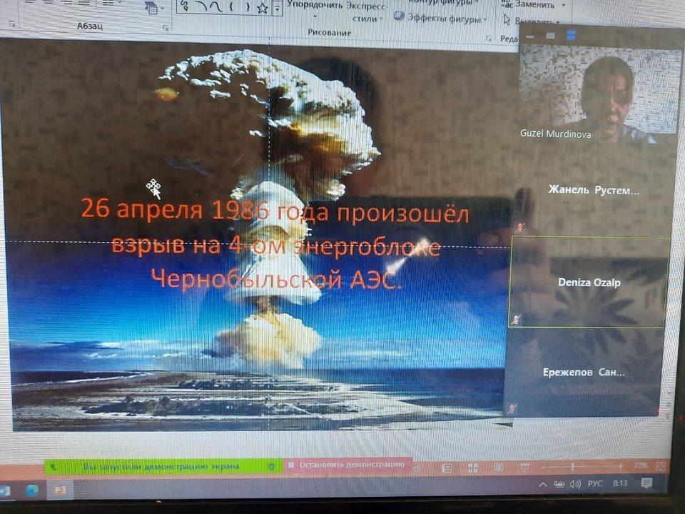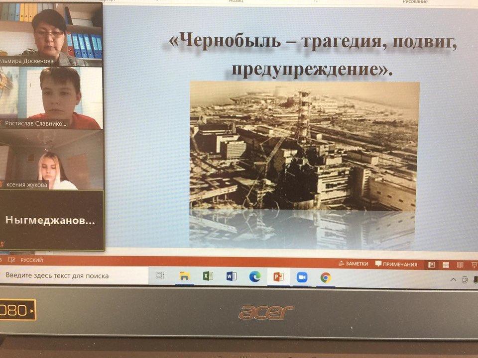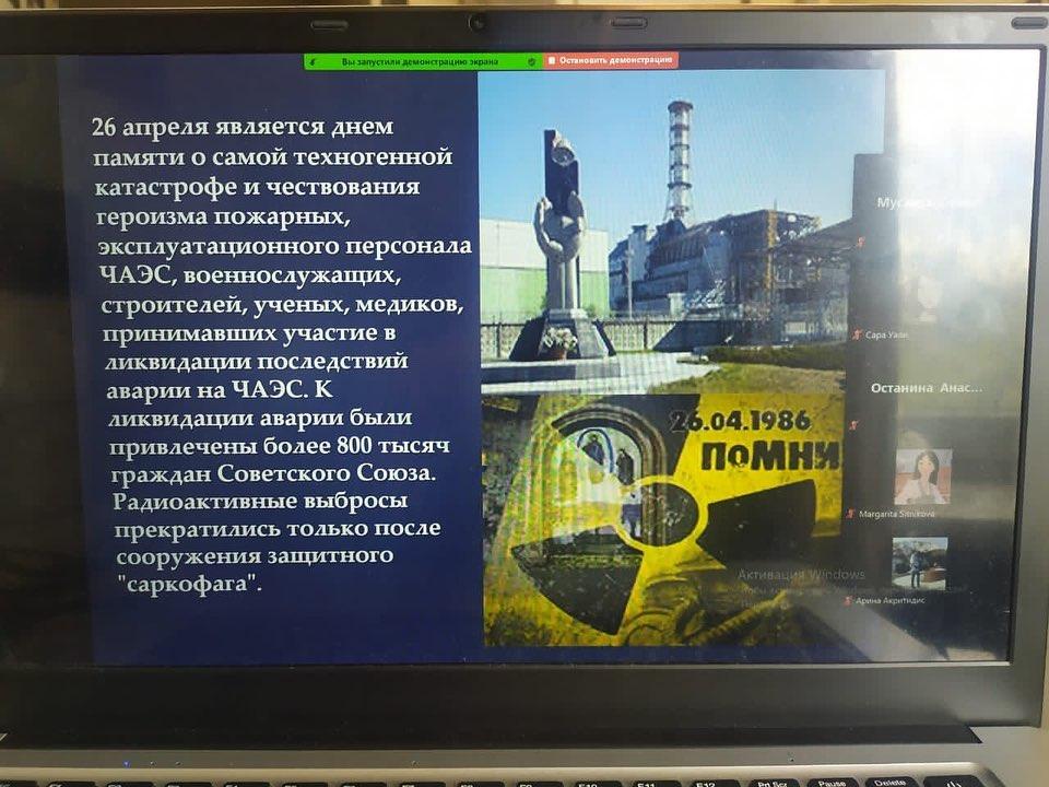 Учениками был закреплён материал о том, что в ночь на 26 апреля 1986 года на четвертом энергоблоке Чернобыльской атомной электростанции (ЧАЭС), расположенной на территории Украины (в то время Украинской ССР) на правом берегу реки Припять в 12 километрах от города Чернобыля Киевской области, произошла крупнейшая в истории мировой атомной энергетики авария. Ребята посмотрели презентацию на данную тему и заслушали сообщения одноклассников о средствах защиты от радиоактивных веществ.