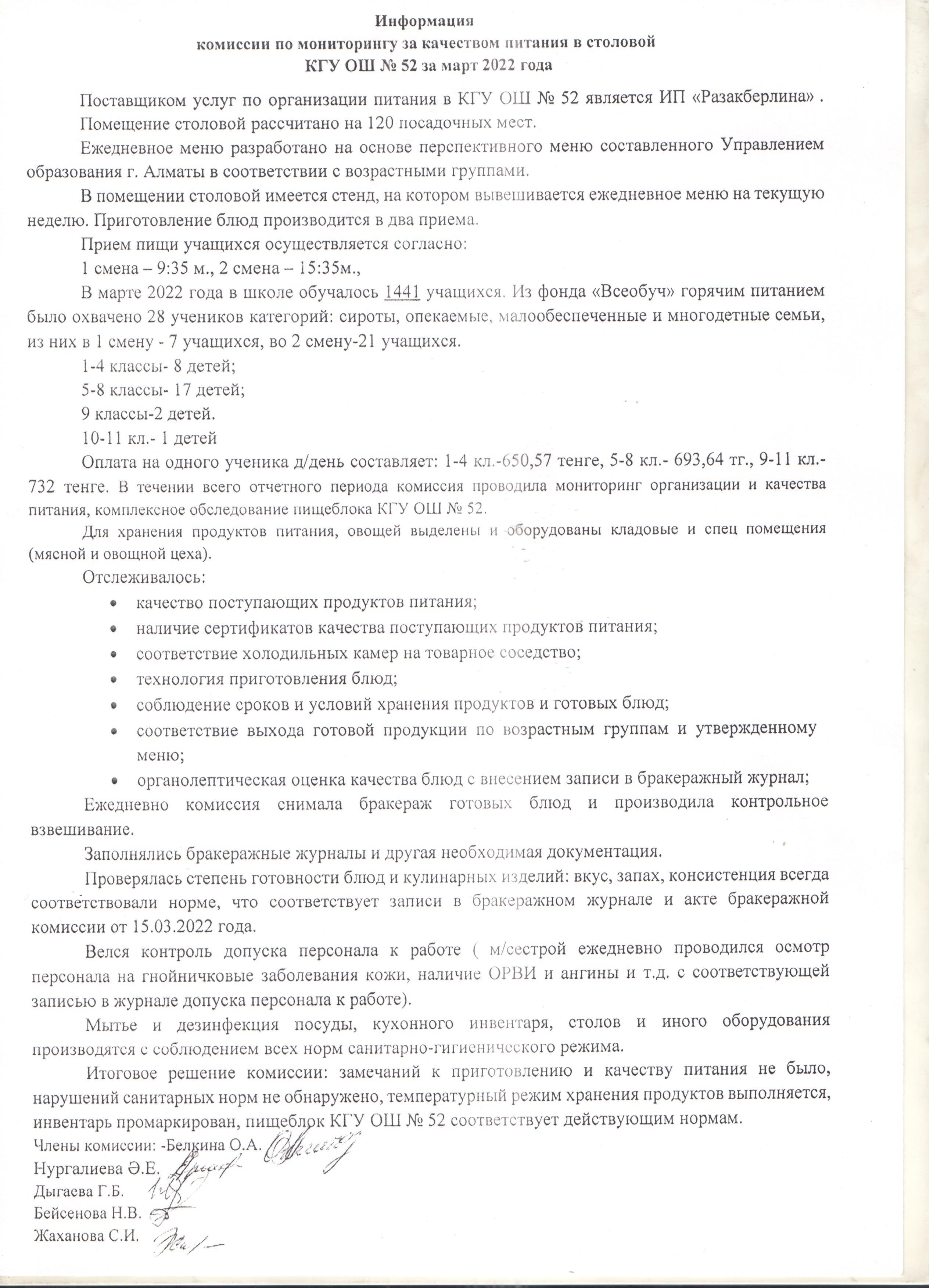 Протокол комиссии по мониторингу за качеством питания в столовой март 2020