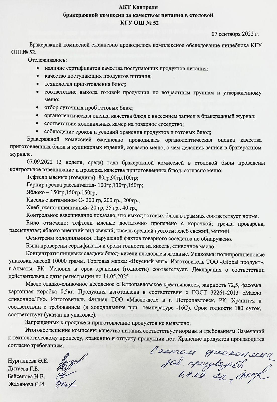 07 сентябрь 2022 0 1 2 3 4 5 АКТ Контроля бракеражной комиссии за качеством питания в столовой КГУ ОШ № 52