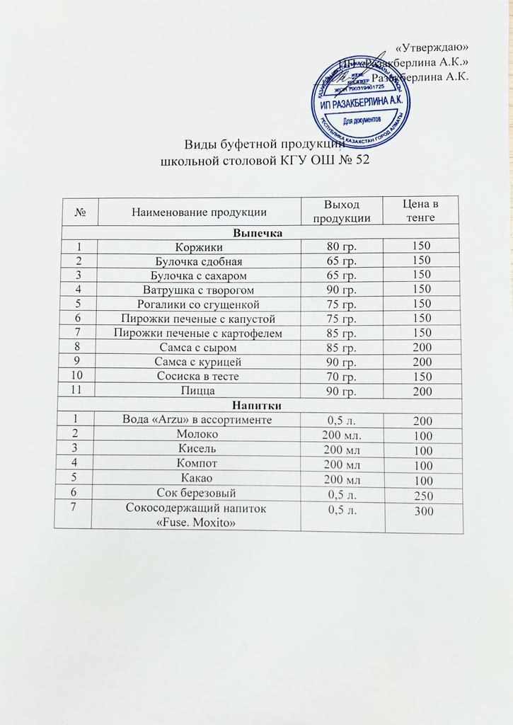 №52ЖББ ОМ КММ асханасының буфет өнімдерінің тізімі